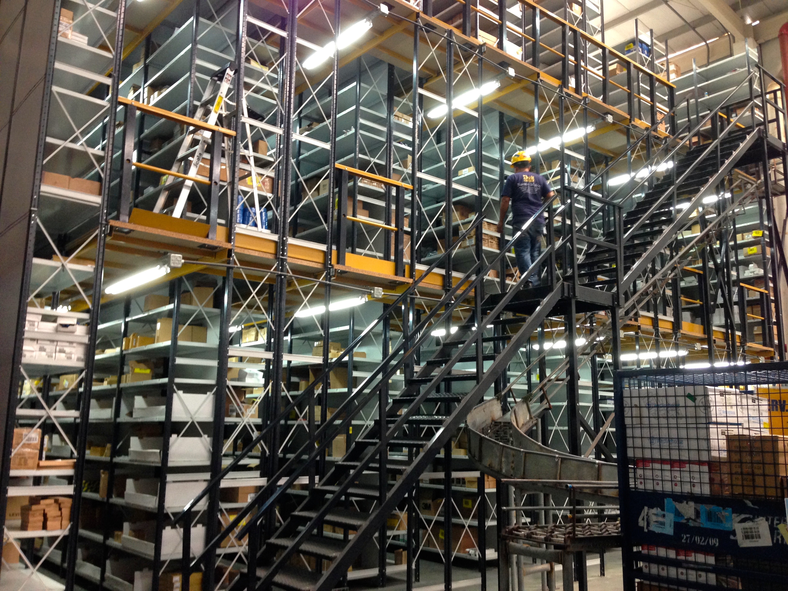 Smaller product is picked from shelving within a 3-level mezzanine area. For products in the mezzanine, this represents the entire warehouse supply (they are not restocked from elsewhere in the warehouse).