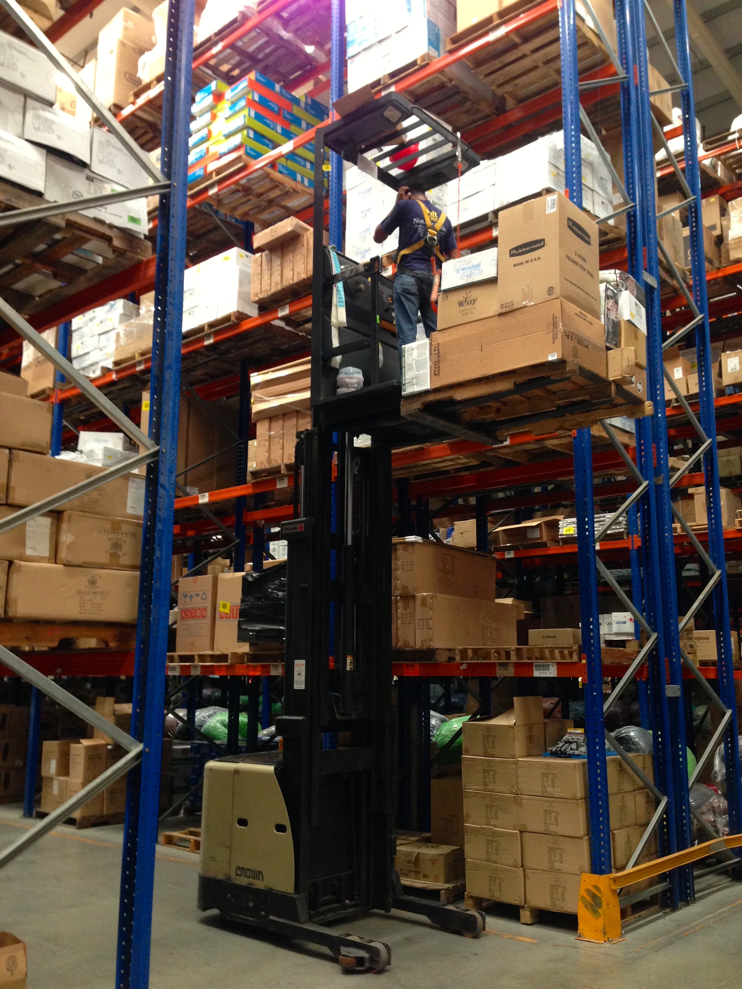 Most of the warehouse holds SKUs in pallet rack either 5 or 6 levels high (the roof is pitched to help shed heavy rains typical of the region). Pickers ride on pallet trucks and build pallets, as directed by the warehouse management system. Mostly they pick cartons, but sometimes they pick pieces from the pallets.